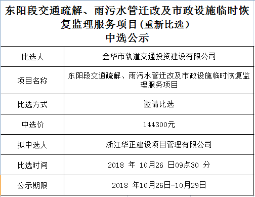 東陽段交通疏解、雨污水管遷改及市政設施臨時恢復監(jiān)理服務項目(重新比選)中選公示