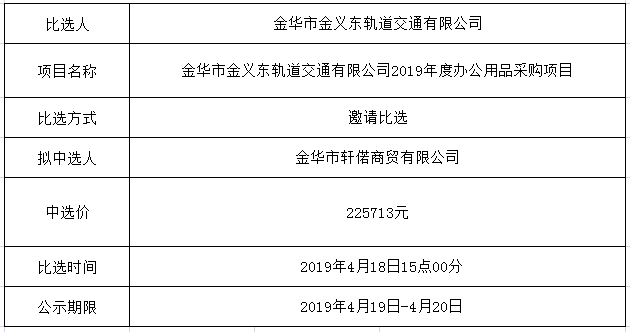 中選公示(金華市金義東軌道交通有限公司2019年度辦公用品采購項(xiàng)目)