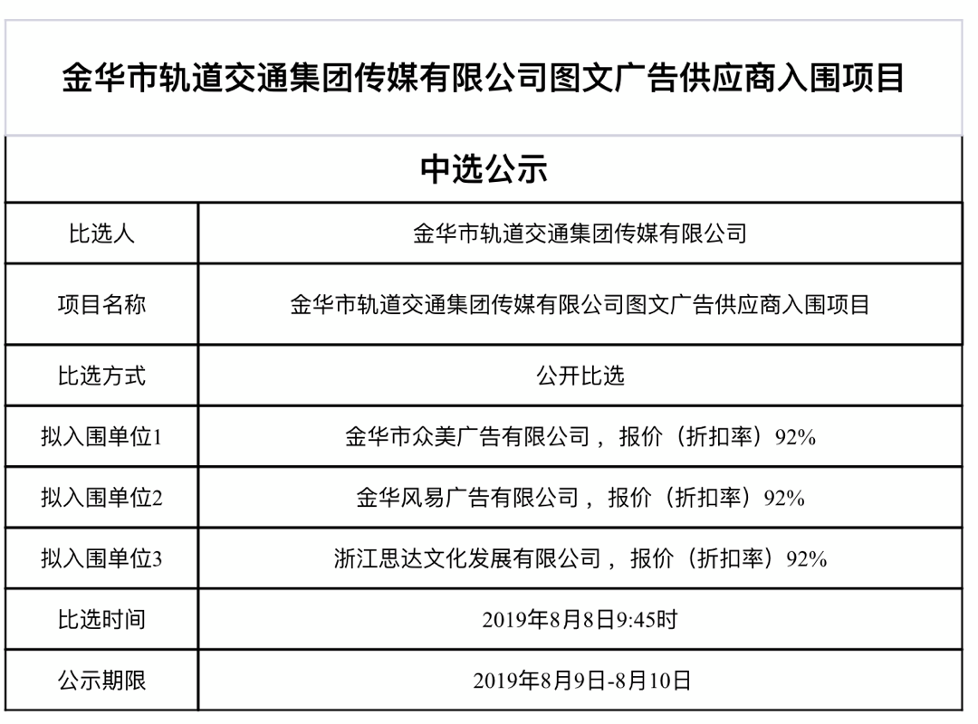金華市金義東軌道交通有限公司運營2026-2027年度活動實施服務機構框架協(xié)議項目中標候選人公示
