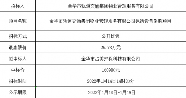 金華市軌道交通集團物業(yè)管理服務(wù)有限公司保潔設(shè)備采購項目中選公告