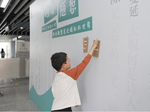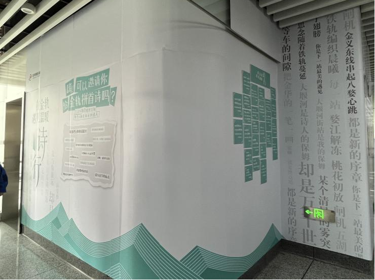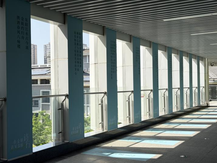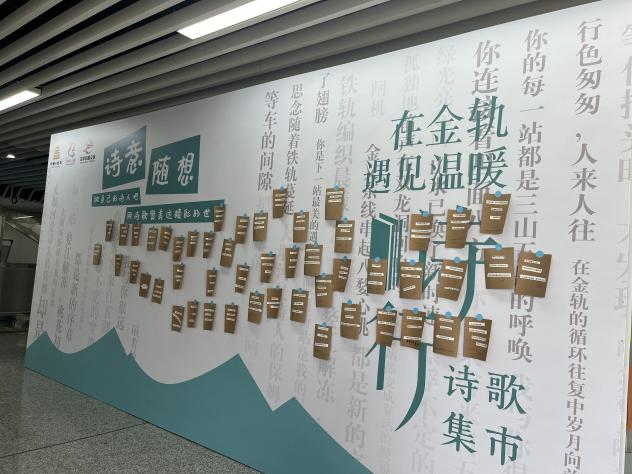 “八詠樓倒影劃過車窗/鐵龍飲雙龍洞髓/城市的脈絡(luò)在眼前清晰呈現(xiàn)”——這面由乘客共同創(chuàng)作的拼貼詩墻,寫滿了金華人的城市記憶與浪漫想象,承載了古婺文脈與現(xiàn)代都市的交響,以詩句為筆,共繪金華的山水詩行。